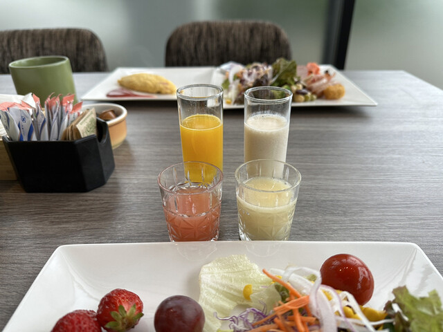 サラダや果物の種類も豊富で。それに、ジュースもミニグラスに少しずついただくことができ、ほんと食卓だけでなく、私たちの気分もカラフルにしてくれました(^O^)/