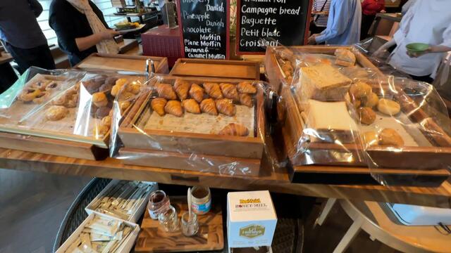 ビュッフェ会場には、カラフルな食事がずらりと並べられていて、パンの種類だけでも10種類以上。いただいたのは、私の好きなクルワッサンとハード系のぶどうが入ったパン。それに、ライ麦の食パンもいただきました。美味い(^O^)/