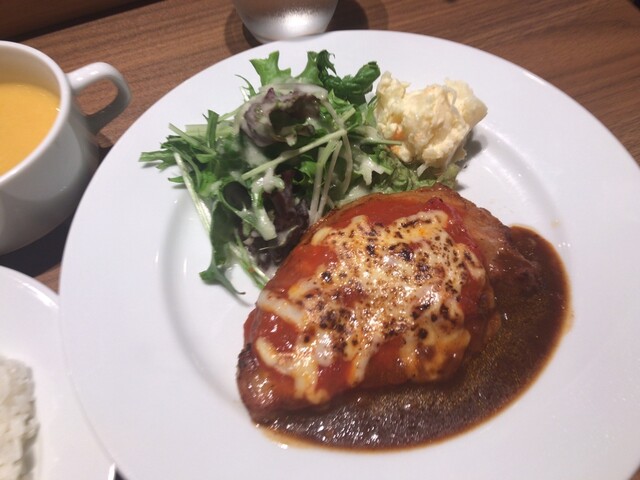 「Aランチ ポークテシノワ(トマトソースチーズ燒き)」(1,200圓) ライスorパン、私はライスを選擇。