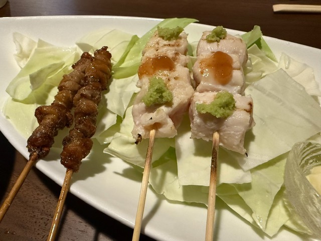 とりかわのぐるぐる、ささみ、名古屋コーチンのササミ、レバー、レバーたたきともものたたき、椎茸のメンチカツ、レアつくね串、つくねユッケ、田中農場の宝玉卵の醬油漬け、とりわさ、赤鶏ささみ昆布〆、最後は自家製プリンまで頂きました!!