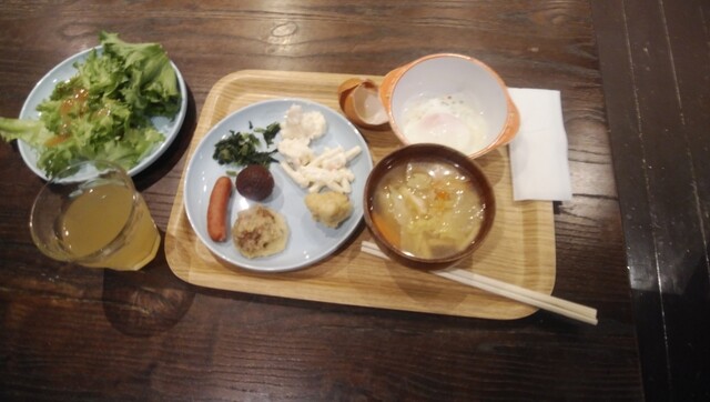 トレイに持ってきたのは、ポテトサラダ・マカロニサラダ・ソーセージ・鶏しんじょう・マッシュルームの揚げたやつ・野沢菜・レタス・ライチ・こう書くと大食いみたいですが、みんなちょっぴりだけですよ。それから、温泉卵はご飯にかけて・具沢山の野菜の味噌汁は一番美味しかったかな。ジュースはリンゴとオレンジ。