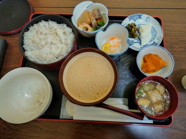 真っ黒な風呂に入って、麦とろ定食。のんびりできました!