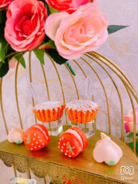 階段を登ると天井いっぱいのドライフラワーに可愛いいちごの装飾そしてテーブルには溢れんばかりのいちごと桃のデザートたち