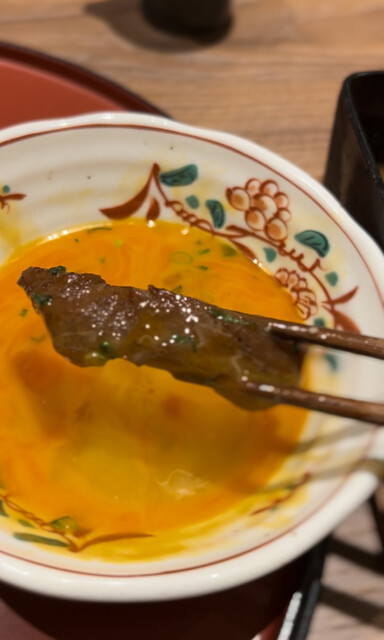 白味噌の甘くて濃厚なお肉を、生卵にくぐらせて頂く。トロけました。
