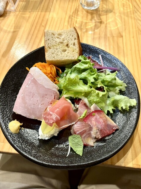 前菜3種盛り合わせ(生ハムシャインマスカットとリコッタチーズ、自家製ハム、ブリのカルパッチョ)