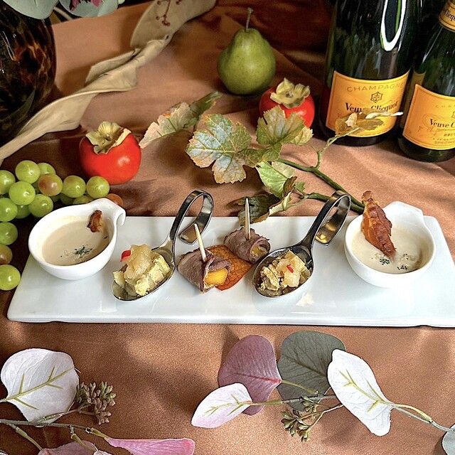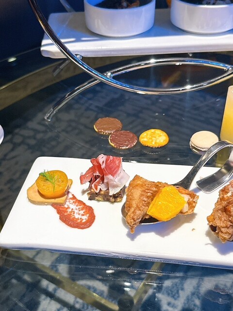 ★スタンドには紅茶やシャンパンと相性のいい梨 や柿など秋のフルーツを一品一品に取り入れた5種の前菜やオシャレな秋鮭のグリルが並んでいます。