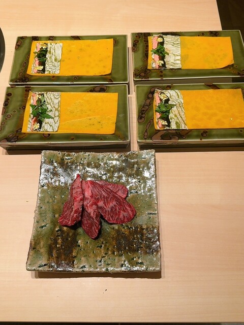 万葉牛のクリミとサガリを、錦糸卵や昆布シート、紅しょうがソース等で自ら巻いて。