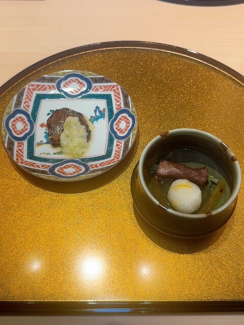 シャトーブリアンでズワイガニを包み込む、まさに贅の極み。うずらの卵や蟹身をヒレ肉で包み、焼肉師が目の前でじっくり焼き上げます。中のカニは冷製仕立てで、肉の熱さとカニの冷たさが混ざり合う絶妙な温度差。柔らかさと旨みが一度に押し寄せる、この店ならではのこだわりが詰まった最高の一品です。