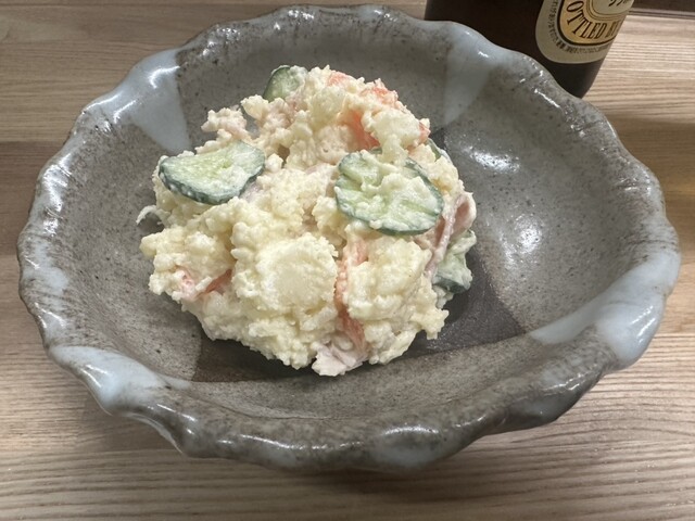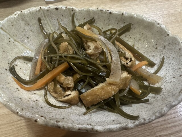 瓶ビールとつまみ(マカロニサラダと糸昆布の旨みが油揚げにしっかりしみた糸昆布煮)を美味しくいただいたあと、