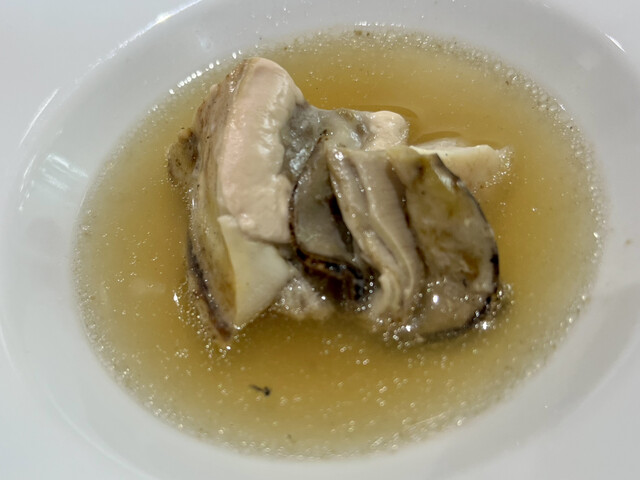 そして舞茸と黒鯛の炭焼きに舌鼓を打ちつつ、スッポンを頂き、そのスッポンと舞茸の出汁スープに入った岩牡蠣の濃厚さったら・・・