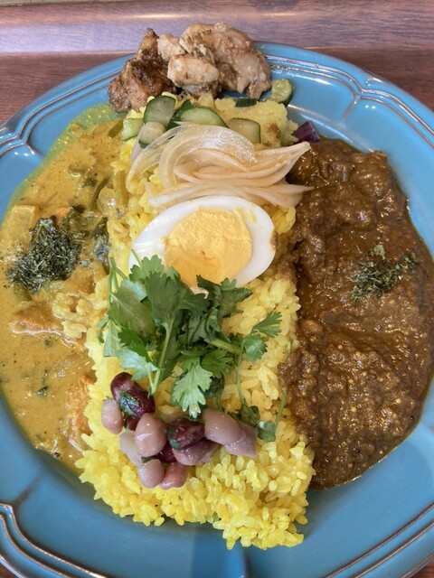 写真は鮭とほうれん草のカレーと、ポークビンダルーカレーのあいがけで1,320円。
