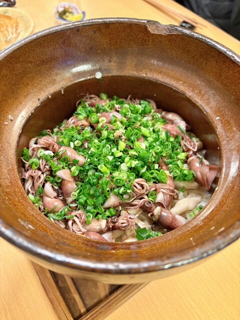 たっぷりの色鮮やかなネギとホタルイカがのった土鍋ごはん