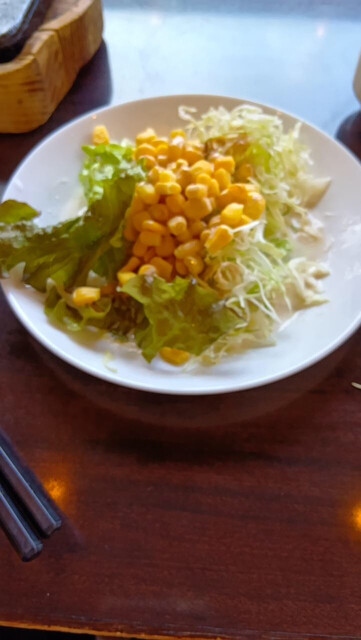 お目当てのサラダは千切りキャベツとサニーレタス、私が取り過ぎたのか3回目には追加されてました。コーンに気づいて盛りました。