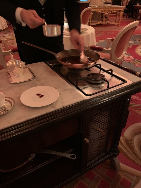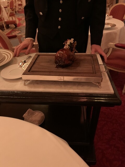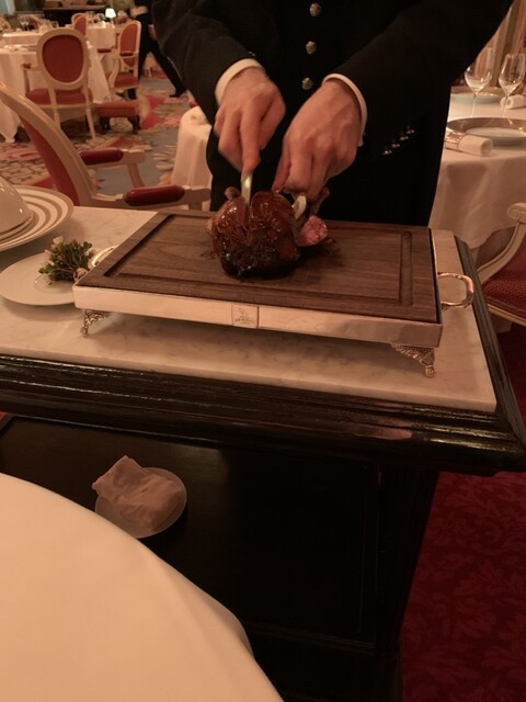 料理で最も印象的だったのはピジョン(pigeon)。肉の塊を目の前でカット。それ以外をプレスという器具の中に入れて血やジュースを抽出し、そのエキスで濃厚なソースを作成。