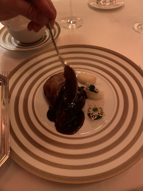 今回も7コースをワインペアリングでいただいた。キャビア・フォアグラ・ロブスター・トリュフ等の高級食材も然ることながら、圧巻はピジョン(鳩)。