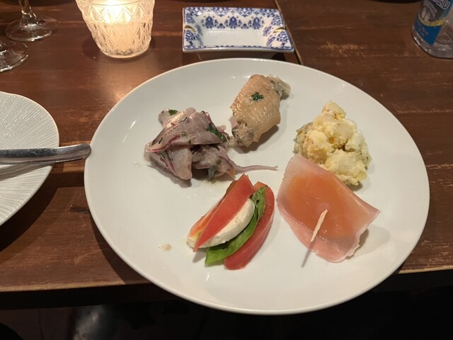 前菜は五種、はまちのカルパッチョ、柿と生ハム、ポテサラ、鳥手羽、トマトとモッツァレラです。