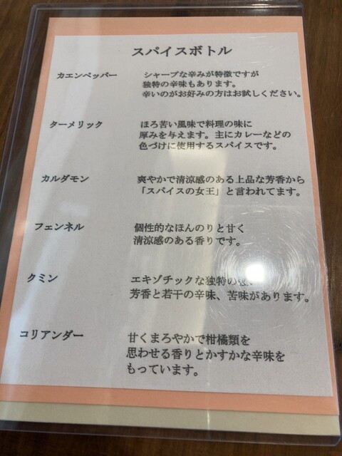テーブルには6種のスパイスボトルがあり スパイスの女王カルダモンまでありました