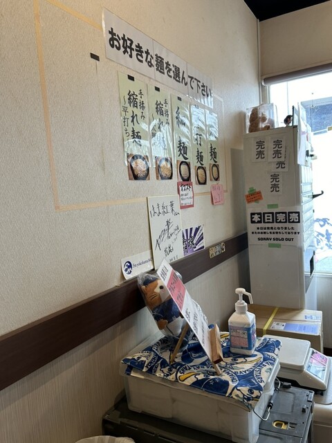 「細麺」、店内掲示で「オススメ!! 喉越し最高!!当店のスープによく合います 是非 お試しください♡」とあります。