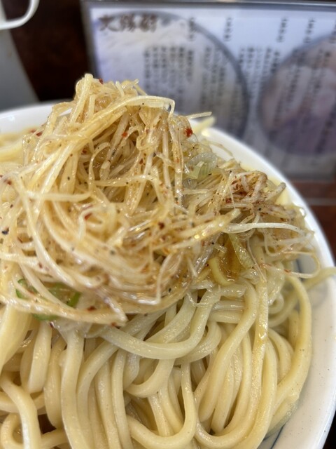 つけ汁の見た目では一見同じ東池袋大勝軒のつけ汁なのですが、この神奈川新町店のこのつけ汁は、もしも東池袋大勝軒某直営店のつけ汁と並べたとしたら、見た目で誰でも別物とわかるくらいの特級つけ汁です。どっちが美味しそうか、誰でもわかると思います。もちろんつけ汁の味は、言うまでもなく「本来の本気の大勝軒のもりそばのつけ汁」、これが本来の山岸一雄さんの味だと私は思っています。