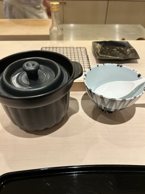 食事のシメは、カウンターで1人分ずつ固形燃料で釜炊きしたご飯。