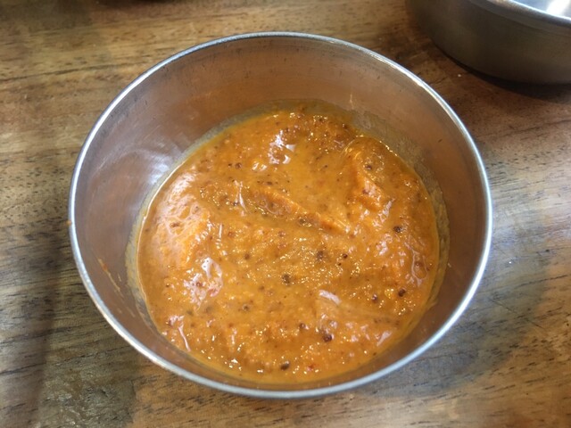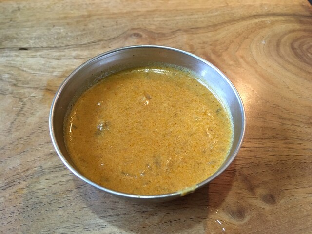 こちらは薄焼きタイプのドーサから、モチモチで分厚いセットドーサに変更しています(+¥100) セットドーサ2枚とサンバルとココナッツチャトニのセットです。セットドーサは優しい味&見た目ですが、表面は結構アブラギッシュなので、指先がギットギトになります。サンバルとココナッツチャトニともよく合って美味しい〜!途中、サンバルとチャトニが無くなってきたあたりで、今度はこれをつけて!とばかりにすかさずチキンカレーのグレービーをサッ!と持ってきてくれました♪