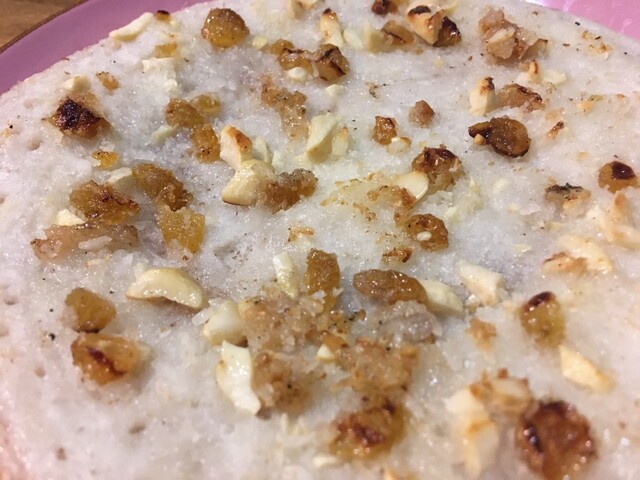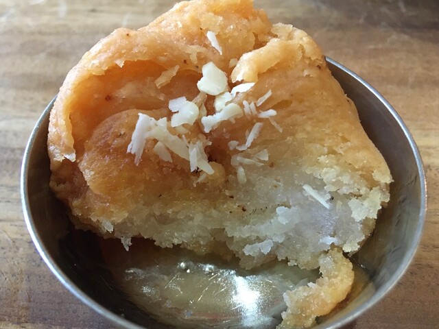 デザート系のドーサは出来ないだろうか、という私の無茶ぶりに対し、こちらを作ってくれました。厚めに焼いたココナッツ風味のモチモチ食感のドーサは素朴な味わいで美味しい〜♪ちなみにココナッツドーサは、レジナさんが子供の頃、お母さんが作ってくれたそうです。