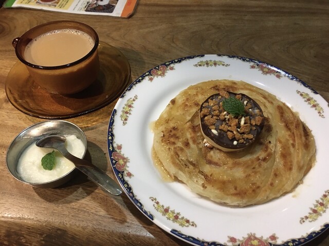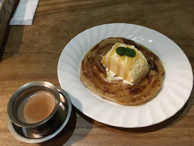 最近始めたという、パラタにギーとハチミツをかけてアイスを乗せた、まずい訳がないデザート&ココナッツ味のデザート(サービス)&チャイ(値段失念)