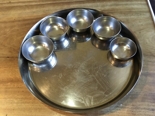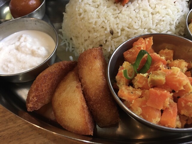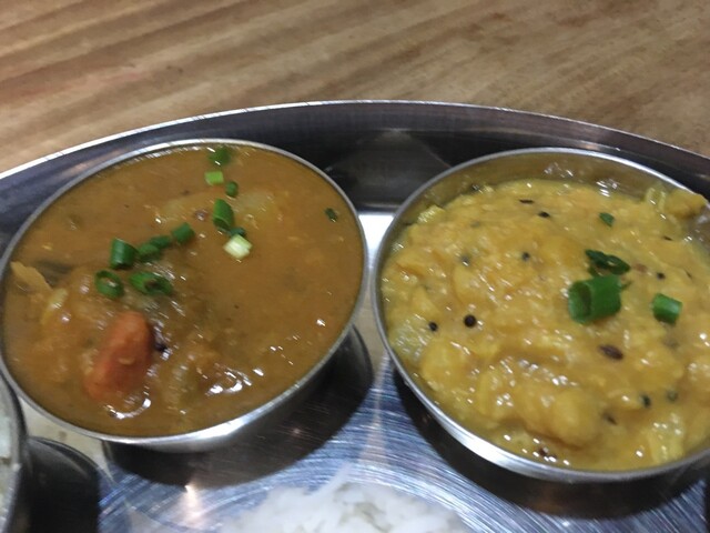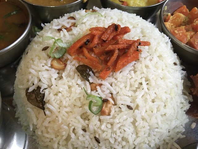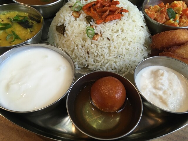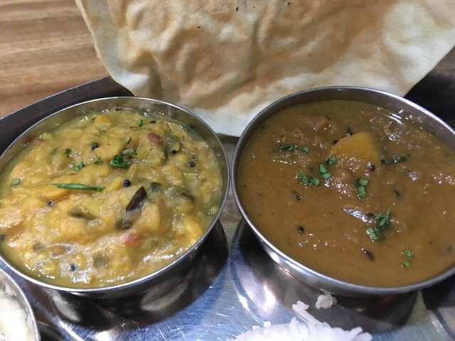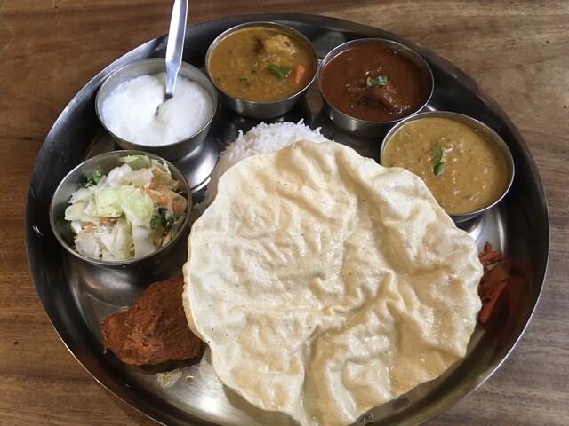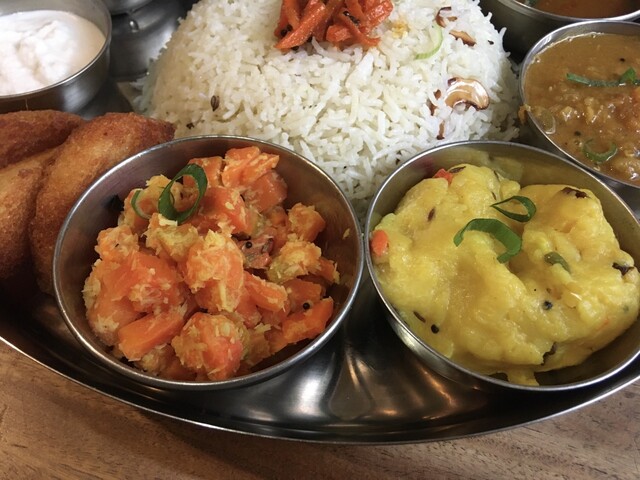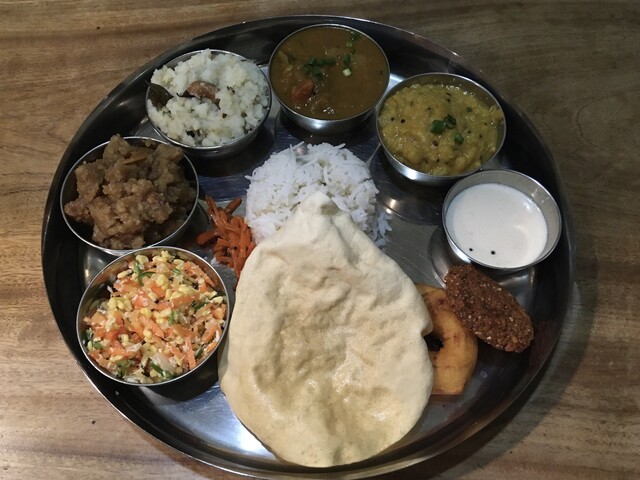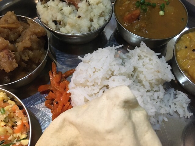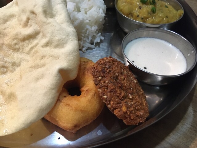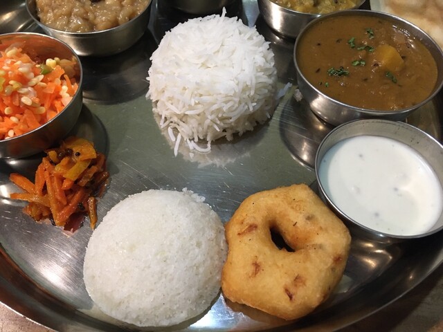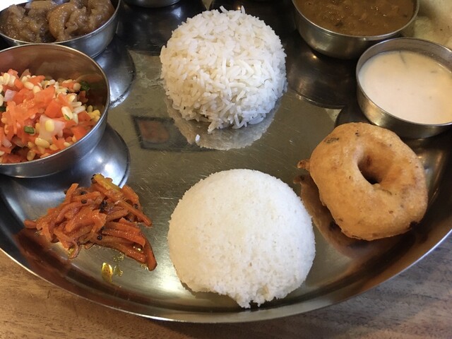 ギーライス、サンバル、ラッサム、ダール、ポリヤル、アヴィアル、イドゥリフライ、ココナッツチャトニ、ヨーグルト、デザート、ドリンクのセットです。もう全部旨い!しみじみ旨い!また食べに行きます(^^)