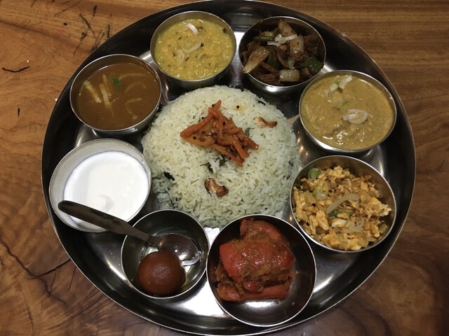 バンガロールの名物だというドンネビリヤニがメインのスペシャルセットです。場所柄的にちょっとマニアックでないんかい?なんて余計な心配をしてしまいましたが、店内に入ると5人くらいのお客さん全員がスペシャルを美味しそうに食べておりました(中には手食をしている女性も)