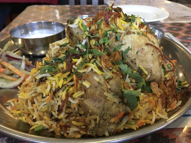 お盆を持つ手首の力も要求される、ハイデラバードチキンダムビリヤニセット