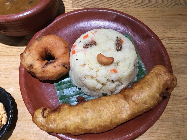 ウプマ、カダラカレー、ウズヌワダのセットです。全体的にさっぱりとした味わいで派手さは無いのですが、食べ進めるうちにこの滋味深い美味しさにハマってしまいました♪このメニューは、ミニサイズのホワイトボードに書いてある程度のアピールだったので、私しか注文していなかったのがもったいないな〜と思ってしまいました。