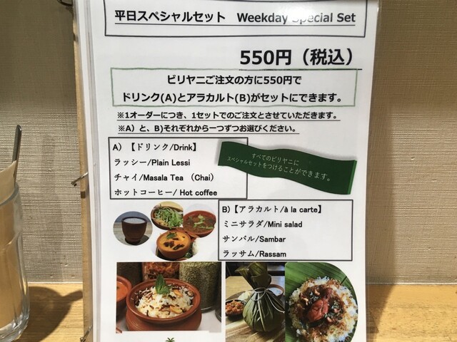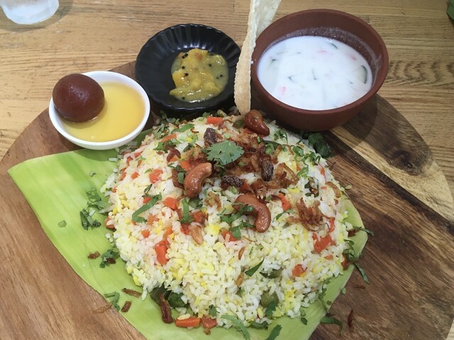 ベジタブルビリヤニにピクルス、ライタ、パパド、デザートのグラブジャムンのセットです。これは美味しい♪肉ビリヤニのようなパンチはありませんが、フワッと香り良く炊けたケララのお米と野菜の甘みの一体感を堪能できます。