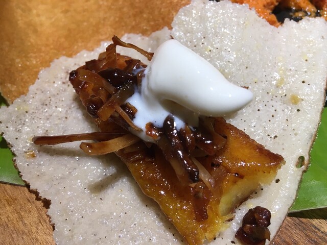 キャラメリゼされたバナナとココナッツの風味がサイコー♪な新丸子店だけで提供されているデザートです。今回はこの他に、プレーンドーサ(¥1,100)とパリップワダ(¥495)も注文して、甘×しょっぱコンビネーションの妙を堪能させていただきました♪