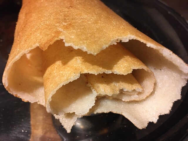 全体を持ってみると、パリパリ系ドーサに比べてズシリとした重さを感じます。場所によって色々な食感を楽しめます♪