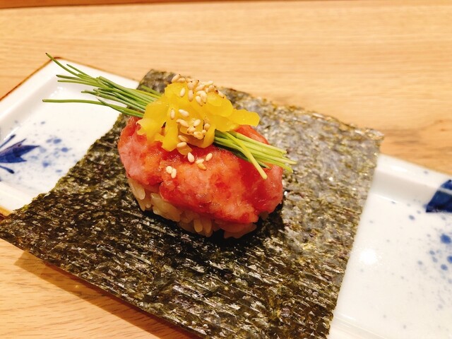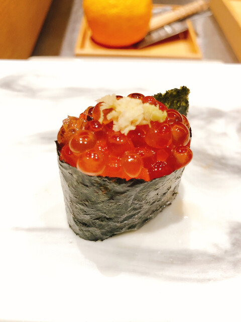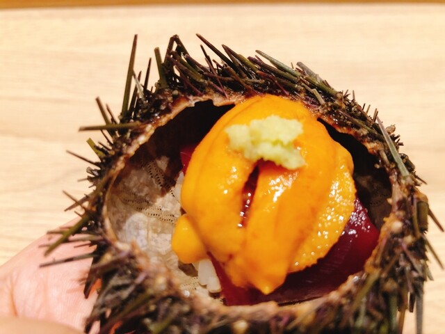 手渡し生雲丹飯 雲丹の下に赤身で巻いたミニ雲丹飯寿司が隠れてます