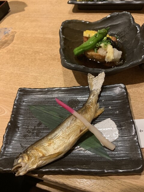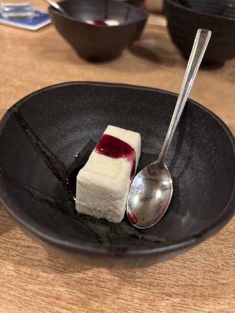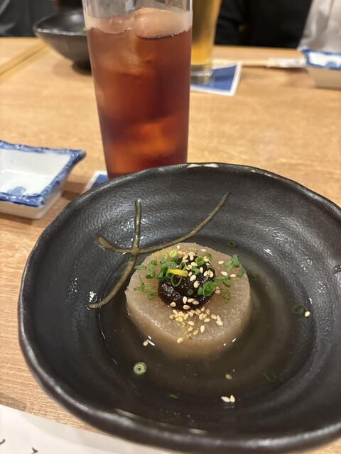 懇親会と忘年会を兼ねてくうひなコースをいただきました。本日のラインナップはお通しのふろふき大根、生牡蠣と白子、生のりのもみじおろしポン酢、お刺身5点盛、鰤の照焼、アジフライ、蟹味噌で和えたカニ、ローストビーフバルサミコ酢添え、生のり茶漬け、レアチーズラズベリーソースと豪勢なお料理の数々でした。どのお料理も美味しかったです。特に鰤の照焼の脂のり最高!新鮮なアジをサクッと揚げてて最高!レモンとかもみじおろしとか青ネギとかお刺身のツマの大根とか柚子皮とか‥そういう物も繊細で、マスターの心意気を感じます。