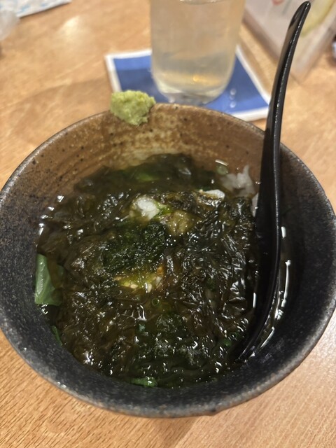 お通し 左からめかぶのせ冷や奴、サメの心臓、とりわさ