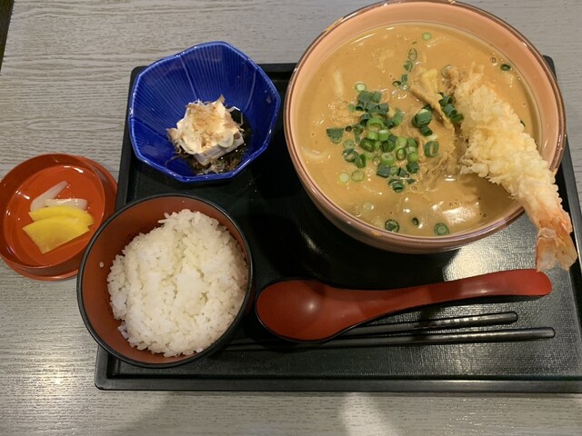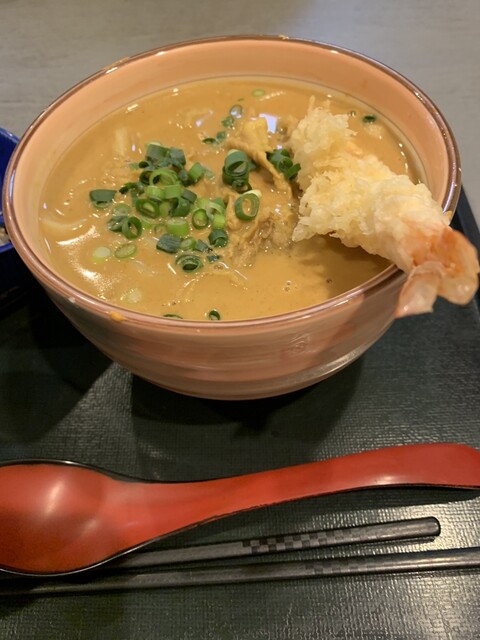 カレーうどんの名店で激ウマなめらかクリーミー「肉+エビ天カレースープうどん」
