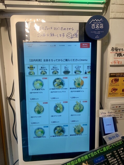 券売機に向かうとスタッフが横にピッタリ付いて、うどんの種類からトッピングまで、タッチパネルの私が選んだ物を押してくれる。
