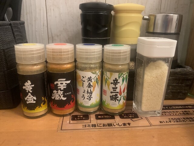 そうだ、七味を振らなくちゃ、と卓上にあった4つの容器の中から中身がオレンジ色の容器をよく見ると一味の感じ。ラベルは「辛蔵」