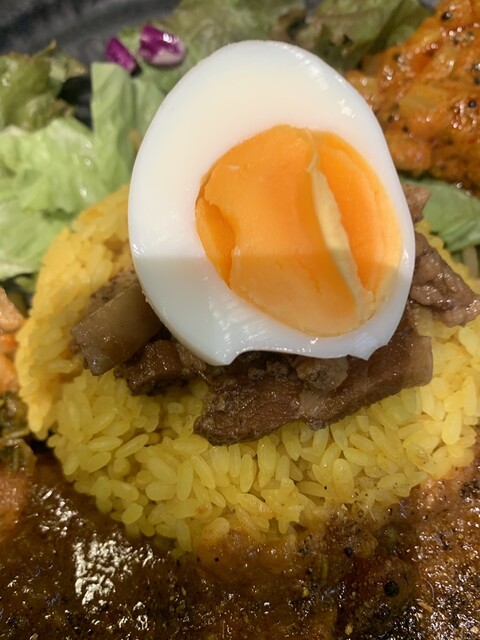 ライスは真ん中に丸いターメリックライス、その上に魯肉が置かれ、更にその上に半熟玉子が乗ってる。