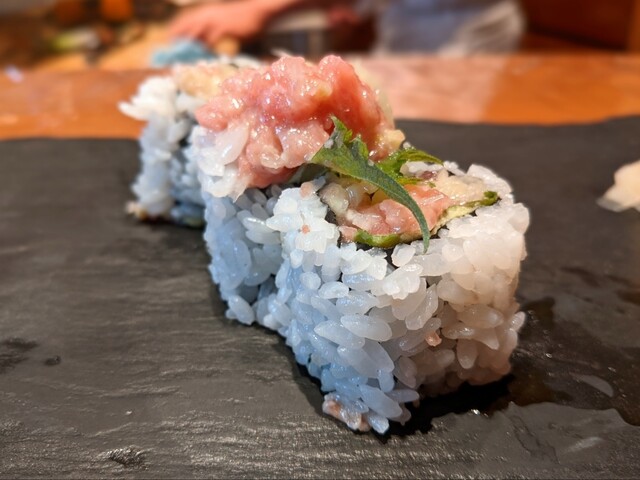 古たくあんの食感でアクセントを与えつつシャリの量を減らすため海苔を内側にして巻くコトによりトロを最良の状態で味わえる本来のコースの締め わさびもたっぷりと使ってるのに脂が凄すぎてあまり感じないw 毎度ながらボリュームと濃厚さが凄い