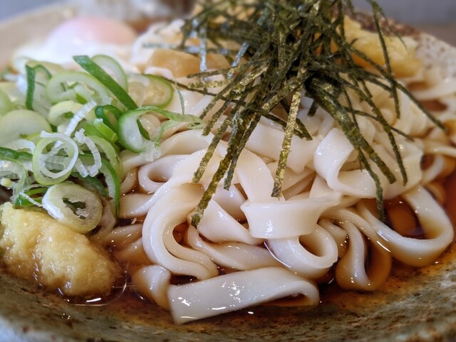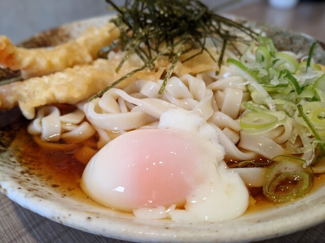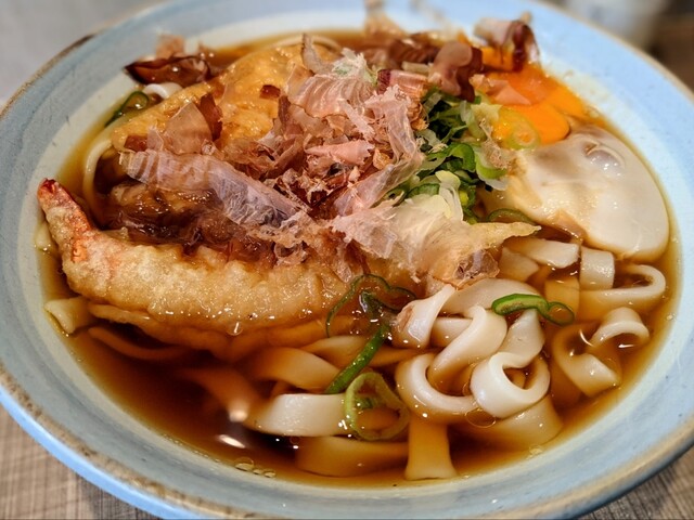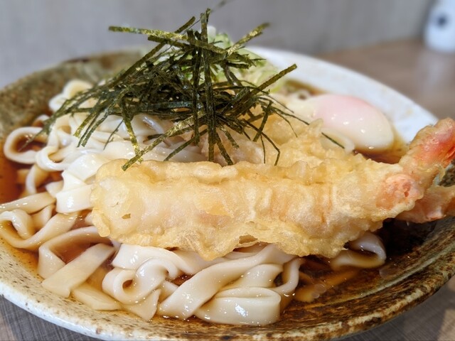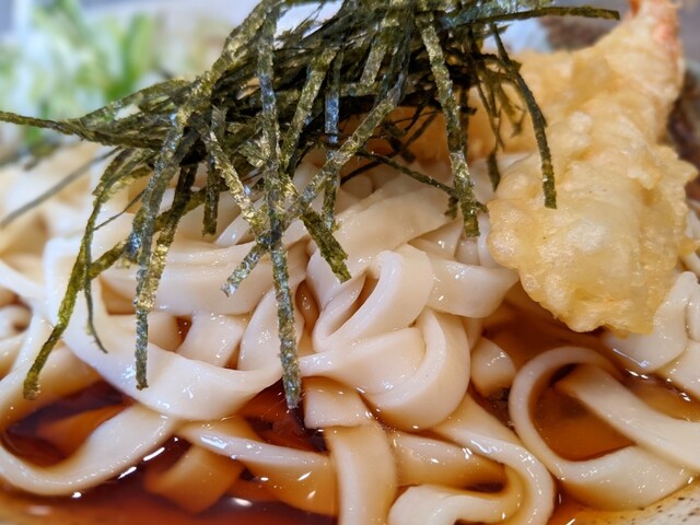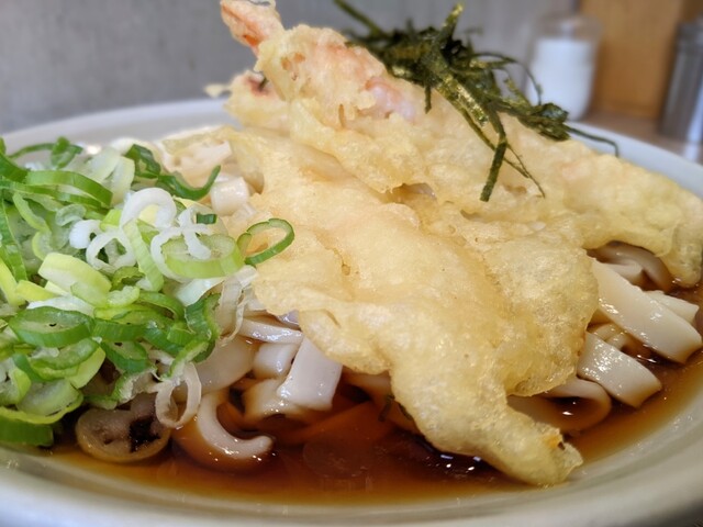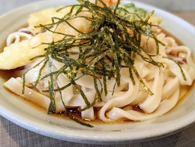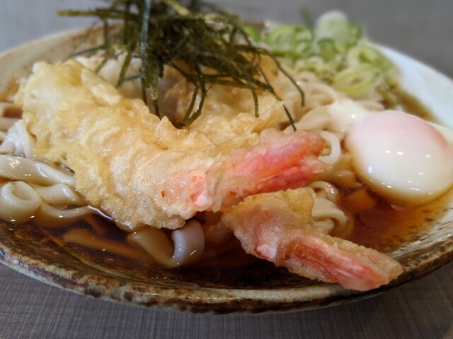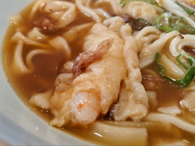 きしめんは冷凍麺茹でたて、エビ天は揚げたてである