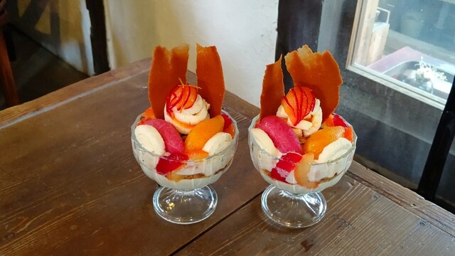 桃のパフェと無花果とこぼれ梅のタルト