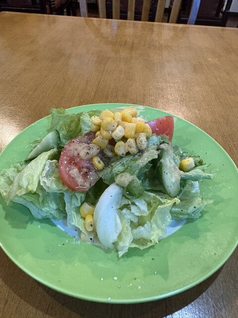 まずはサラダが登場。レタスやトマト、キュウリとコーンが盛られたシンプルなサラダだ。ベジーファーストを決める。