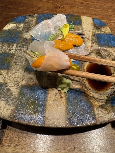 旨味のあるヒラメとウニのがとても良くあっていてたっぷりのウニを巻いて食べると旨みが広がる贅沢な一品。