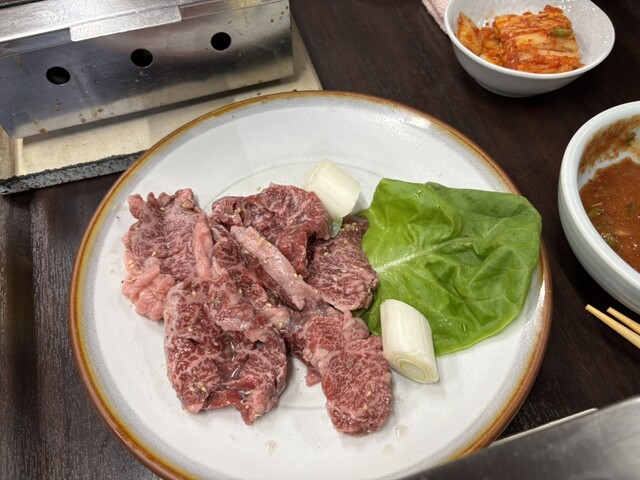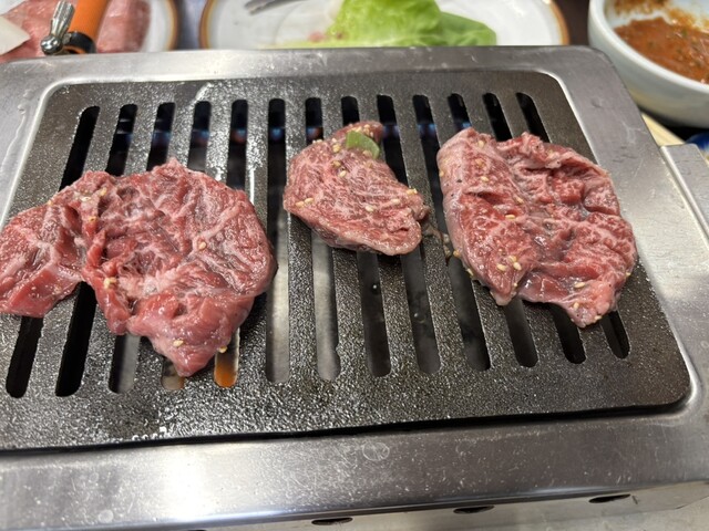 焼肉はどれも脂の入り方が最高で、どれも噛まなくても食べられてしまいそうなほどです。特にロースが最高で、タレと絡めると脂と赤身の旨さが引き立ちます。