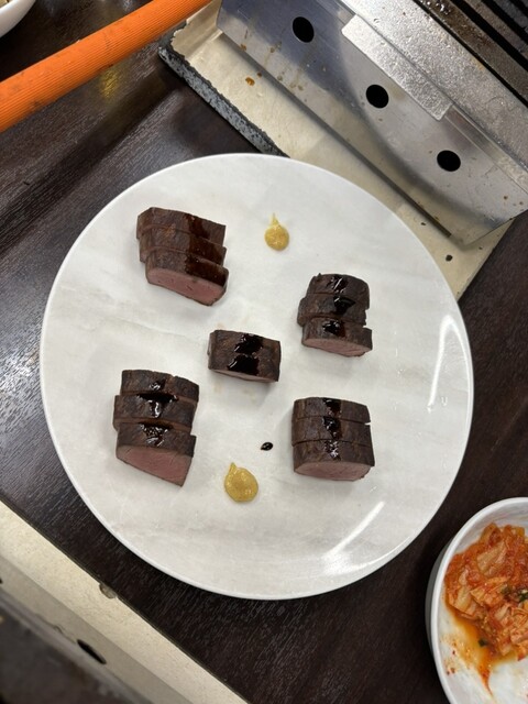 待った甲斐があってビールがとても美味しく感じました。列に並んでいるときにオーダーした焼肉が徐々に来ます。カクテキとキムチはタレが甘めかつ濃厚で、タレだけでも一杯飲めそうなほどです。