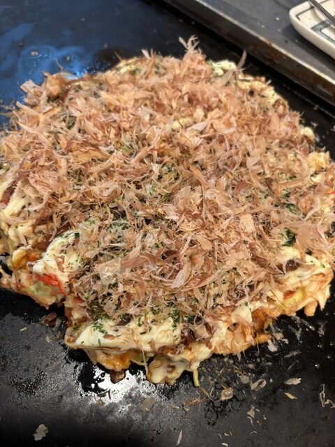 もんじゃは切りイカもんじゃとカレーもんじゃ、お好み焼きは紅しょうが天を頼みました。切りイカはスルメを細く割いたものだそうです。店員さんのオススメで、カレーもんじゃにはコンビーフとチーズをトッピングしました。安く済ませようと思いきや、あまりにも大きく、あまりにも美味しくてびっくりしました。特に、もんじゃは出汁が他店と全然違うのと、具材が大きくて食べ応えがあります。店員さんが目の前で焼いてくれて、自分で焼くよりも間違いなく美味しいです。臨場感が食欲をそそります。