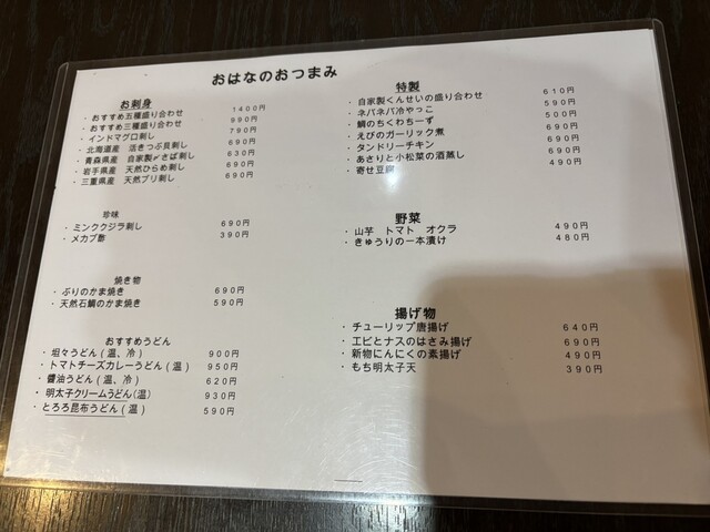 うどん百名店でうどんが美味しいことはもちろんですが、個人的にはおつまみがどれも丁寧なつくりで好きです。特に刺身がいつも新鮮、脂が乗っていて分厚く切っていただけるのでとてもお得です。4切れ×5種盛りで1500円とリーズナブル。最高です。